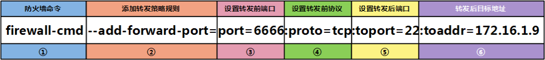 # firewall-cmd --permanent --zone=public --add-forward-port=port=6666:proto=tcp:toport=22:toaddr=172.16.1.9 # firewall-cmd --reload