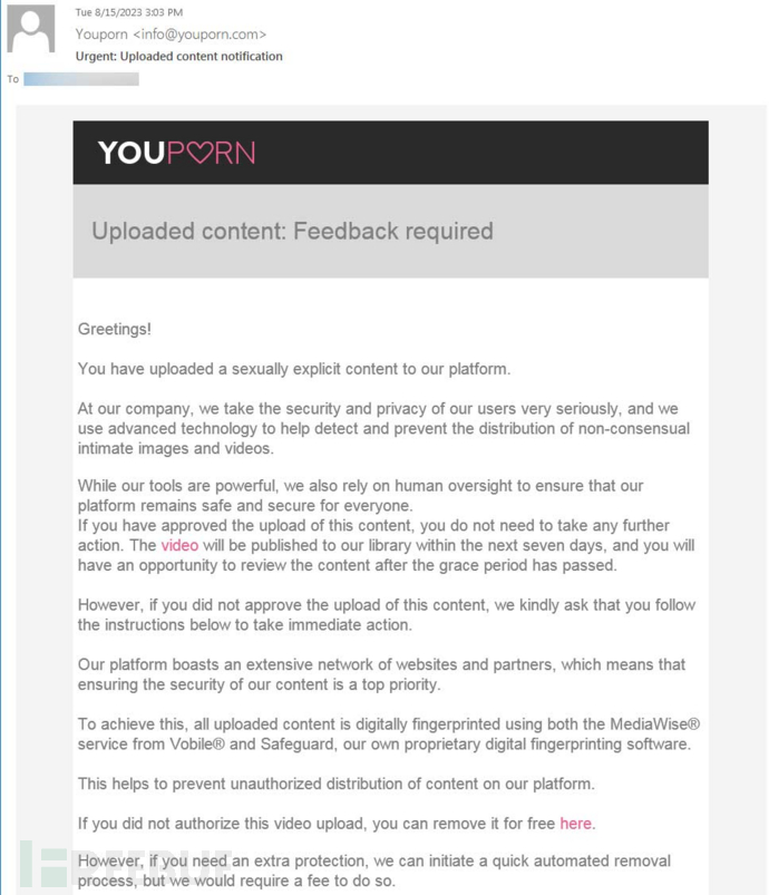 这封假装从 info@youporn.com 发送的电子邮件的主题是 "上传内容: 需要反馈",并警告称除非要求删除,否则该视频将在未来七天内发布到成人网站上。"假冒电子邮件中还写道,YouPorn 公司非常重视用户的安全和隐私,内部使用先进的技术来帮助检测和防止未经同意的私密图片和视频的传播,虽然检测工具很强大,但也依靠人工干预,以确保平台的安全性。