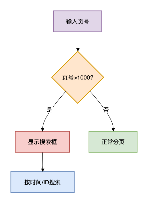 复制public PageResult query(int page, int size) { if (page > MAX_PAGE) { throw new BusinessException("最多查询前" + MAX_PAGE + "页"); } // ... }1.2.3.4.5.6.2. 跳页转搜索