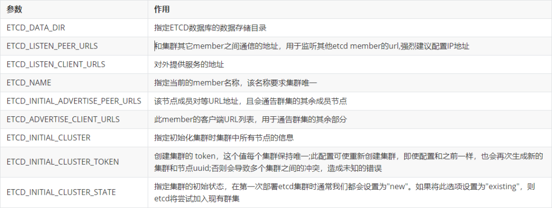 # 10.0.0.102的etcd配置文件 root@k8s-102 ~ # egrep -v "^#" /etc/etcd/etcd.conf ETCD_DATA_DIR="/var/lib/etcd/default.etcd" ETCD_LISTEN_PEER_URLS="http://0.0.0.0:2380" ETCD_LISTEN_CLIENT_URLS="http://0.0.0.0:2379" ETCD_NAME="k8s-102" ETCD_INITIAL_ADVERTISE_PEER_URLS="http://10.0.0.102:2380" ETCD_ADVERTISE_CLIENT_URLS="http://10.0.0.102:2379" ETCD_INITIAL_CLUSTER="k8s-102=http://10.0.0.102:2380,k8s-103=http://10.0.0.103:2380,k8s-104=http://10.0.0.104:2380" ETCD_INITIAL_CLUSTER_TOKEN="oldboyedu-etcd-cluster" ETCD_INITIAL_CLUSTER_STATE="new" # 10.0.0.103的亿华云计算etcd配置文件 root@k8s-103 ~ # egrep -v "^#" /etc/etcd/etcd.conf ETCD_DATA_DIR="/var/lib/etcd/default.etcd" ETCD_LISTEN_PEER_URLS="http://0.0.0.0:2380" ETCD_LISTEN_CLIENT_URLS="http://0.0.0.0:2379" ETCD_NAME="k8s-103" ETCD_INITIAL_ADVERTISE_PEER_URLS="http://10.0.0.103:2380" ETCD_ADVERTISE_CLIENT_URLS="http://10.0.0.103:2379" ETCD_INITIAL_CLUSTER="k8s-102=http://10.0.0.102:2380,k8s-103=http://10.0.0.103:2380,k8s-104=http://10.0.0.104:2380" ETCD_INITIAL_CLUSTER_TOKEN="oldboyedu-etcd-cluster" ETCD_INITIAL_CLUSTER_STATE="new" # 10.0.0.104的etcd配置文件 root@k8s-104 ~ # egrep -v "^#" /etc/etcd/etcd.conf ETCD_DATA_DIR="/var/lib/etcd/default.etcd" ETCD_LISTEN_PEER_URLS="http://0.0.0.0:2380" ETCD_LISTEN_CLIENT_URLS="http://0.0.0.0:2379" ETCD_NAME="k8s-104" ETCD_INITIAL_ADVERTISE_PEER_URLS="http://10.0.0.104:2380" ETCD_ADVERTISE_CLIENT_URLS="http://10.0.0.104:2379" ETCD_INITIAL_CLUSTER="k8s-102=http://10.0.0.102:2380,k8s-103=http://10.0.0.103:2380,k8s-104=http://10.0.0.104:2380" ETCD_INITIAL_CLUSTER_TOKEN="oldboyedu-etcd-cluster" ETCD_INITIAL_CLUSTER_STATE="new"相关参数说明如下:
