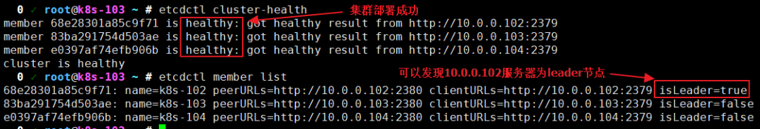 # 启动etcd服务 systemctl start etcd.service systemctl enable etcd.service # 验证集群是否配置成功 etcdctl cluster-health etcdctl member list如下图所示,只需只需以下的相关命令就可以检测集群是否正常,也可以查看集群谁是leader节点