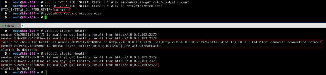 # 任意选择一个节点手动制作故障,只需执行下面3条命令,则会导致服务无法正常启动 systemctl stop etcd.service >/var/lib/etcd/default.etcd/member/wal/0000000000000000-0000000000000000.wal systemctl start etcd.service # 尝试删除故障节点的数据进行恢复失败,只需执行下面2条命令 rm -rf /var/lib/etcd/default.etcd/* systemctl restart etcd.service # 将故障节点的member移除 etcdctl member remove e0397af74efb906b # 重新添加故障节点的member etcdctl member add 10.0.0.102 http://10.0.0.104:2380 # 重新修改etcd的配置文件,只需修改一处并重启服务即可 sed -i "/^ *ETCD_INITIAL_CLUSTER_STATE/ s#new#existing#" /etc/etcd/etcd.conf systemctl restart etcd # 观察集群状态 如下图所示,我们可以通过"etcdctl cluster-health"查看集群的健康状态