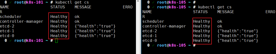 # 修改apiserver的地址(值得注意的是,相比第一次安装主要是注意etcd集群的指定) # egrep -v "^#|^$" /etc/kubernetes/apiserver KUBE_API_ADDRESS="--insecure-bind-address=0.0.0.0" KUBE_ETCD_SERVERS="--etcd-servers=http://10.0.0.102:2379,http://10.0.0.103:2379,http://10.0.0.104:2379" KUBE_SERVICE_ADDRESSES="--service-cluster-ip-range=10.254.0.0/16" KUBE_ADMISSION_CONTROL="--admission-control=NamespaceLifecycle,NamespaceExists,LimitRanger,SecurityContextDeny,ServiceAccount,ResourceQuota" KUBE_API_ARGS="" # 无需修改config文件,因为默认的controller-manager, scheduler, 和proxy组件均为本地回环地址 # egrep -v "^#|^$" /etc/kubernetes/config KUBE_LOGTOSTDERR="--logtostderr=true" KUBE_LOG_LEVEL="--v=0" KUBE_ALLOW_PRIV="--allow-privileged=false" KUBE_MASTER="--master=http://127.0.0.1:8080" # 将master节点的配置直接拷贝到另外一个节点即可 cd /etc/kubernetes/ scp apiserver 10.0.0.105:`pwd` # 所有master节点都需要重启相关服务 systemctl restart kube-controller-manager.service kube-scheduler.service kube-apiserver.service && systemctl enable kube-controller-manager.service kube-scheduler.service kube-apiserver.service # 验证master组件是否部署成功 kubectl get cs如下图所示,IT技术网etcd集群和master节点均处于正常状态