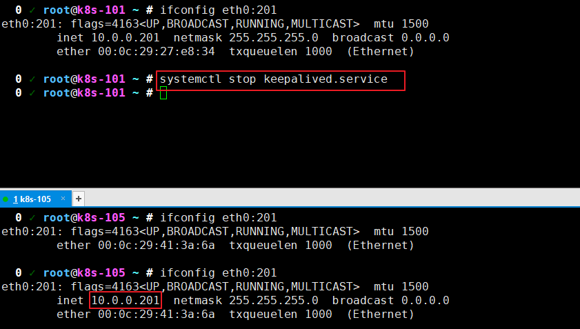 # 为所有节点部署keepalived组件 yum -y install keepalived # "10.0.0.101"节点修改配置文件如下(注意修改"interface"和"virtual_ipaddress") cat >/etc/keepalived/keepalived.conf<<EOF ! Configuration File for keepalived global_defs { router_id LVS_DEVEL_11 } vrrp_instance VI_1 { state MASTER interface eth0 virtual_router_id 51 priority 100 advert_int 1 authentication { auth_type PASS auth_pass 1111 } virtual_ipaddress { 10.0.0.201/24 dev eth0 label eth0:201 } } EOF # "10.0.0.105"节点修改配置文件如下(注意修改"interface"和"virtual_ipaddress") cat >/etc/keepalived/keepalived.conf<<EOF ! Configuration File for keepalived global_defs { router_id LVS_DEVEL_12 } vrrp_instance VI_1 { state BACKUP interface eth0 virtual_router_id 51 priority 80 advert_int 1 authentication { auth_type PASS auth_pass 1111 } virtual_ipaddress { 10.0.0.201/24 dev eth0 label eth0:201 } } EOF # 重启服务并设置开机自启动 systemctl enable keepalived && systemctl start keepalived # 将目前VIP所在节点停止keepalived服务,观察是否能实现VIP飘逸 systemctl stop keepalived # 如下图所示,我成功的实现了节点飘逸哟 systemctl start keepalived # 在101节点重新启动后,不难发现节点又会重新夺回主动权啦!温馨提示: